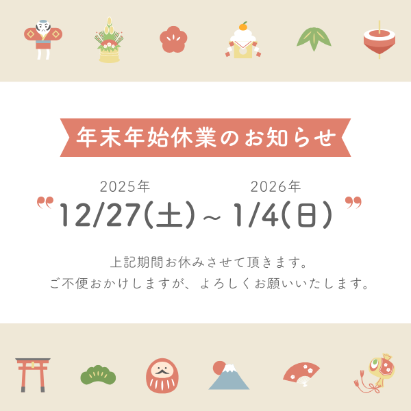 12月26日(金)以降のご注文は年明けの1月5日(月)より順次発送となりますので、ご了承ください。
